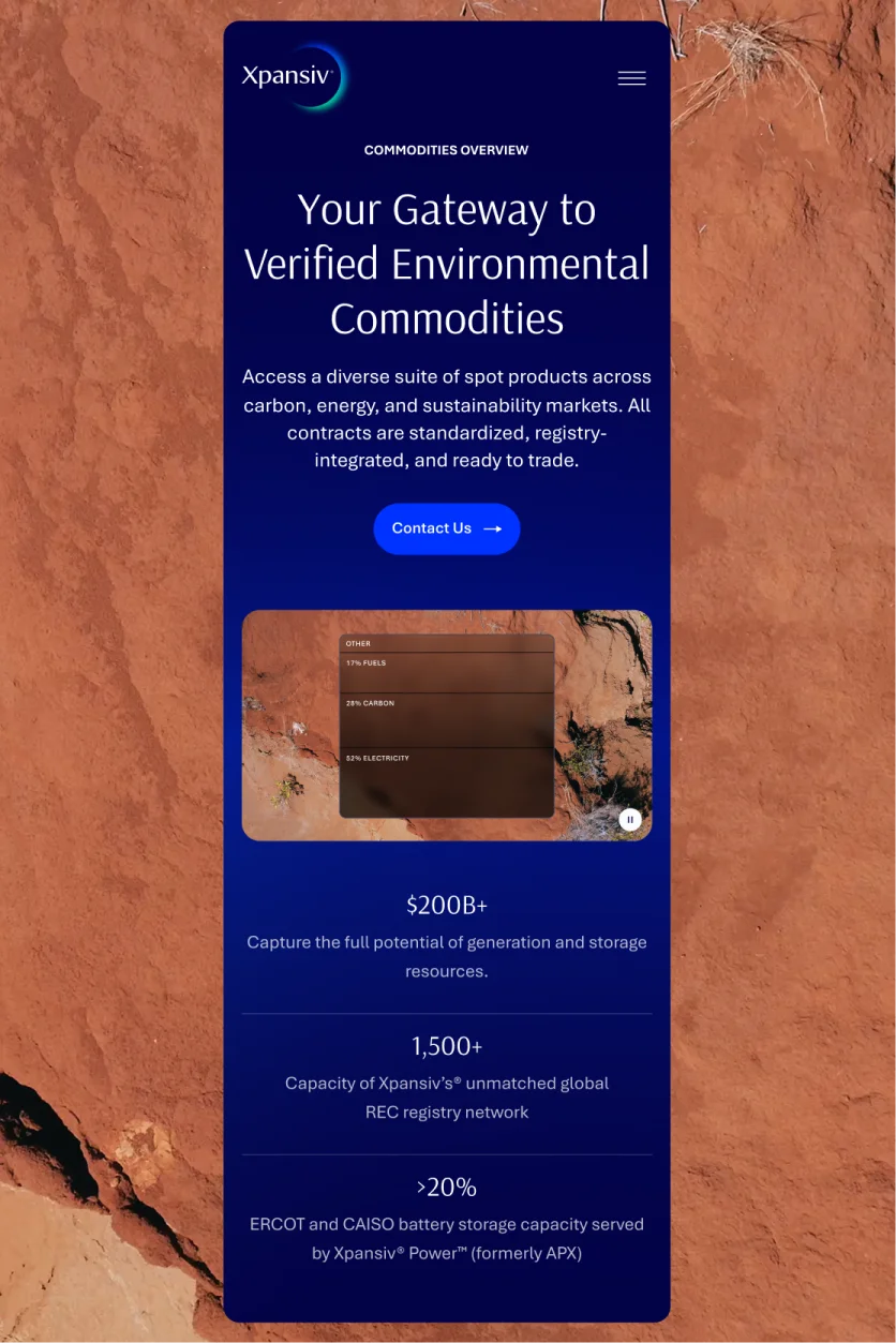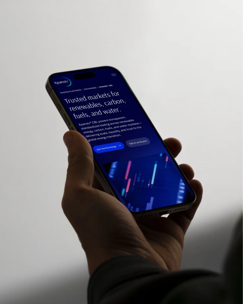 Xpansiv operates at the intersection of carbon markets, renewable energy credits, and environmental commodities—serving everyone from compliance officers to carbon traders to CFOs trying to make sense of climate-driven market risk. When we started, their digital presence reflected that sprawl: multiple product sites, inconsistent messaging, and a brand identity that couldn't quite carry the weight of what they actually do. We set out to unify a growing mix of brands, marketplaces, registries, and trading platforms into a single branded-house system—one cohesive identity designed to scale across every product, market, and audience. In parallel, we reimagined Xpansiv’s website as the central expression of that system: a connected brand and web platform that brings structure to a complex ecosystem, clarifies the story, and creates a flexible foundation built to evolve over time.